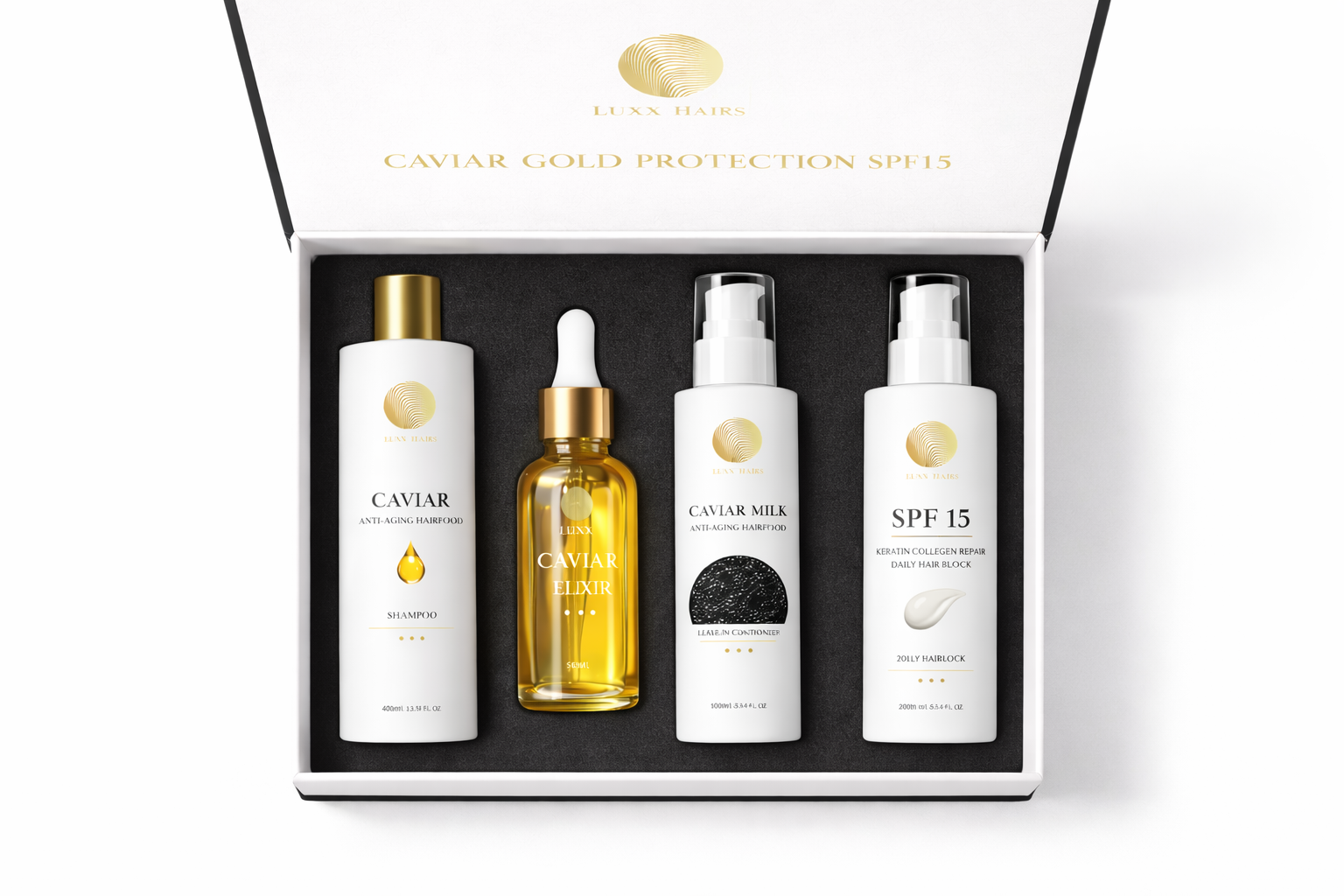 Erlebe Haarpflege auf höchstem Niveau mit dem Luxx Hairs Home Products Starter Kit – einer exklusiven 4-teiligen Pflegeroutine aus der edlen Caviar Care Linie, ergänzt durch den SPF15 Glow & Glossy Booster.